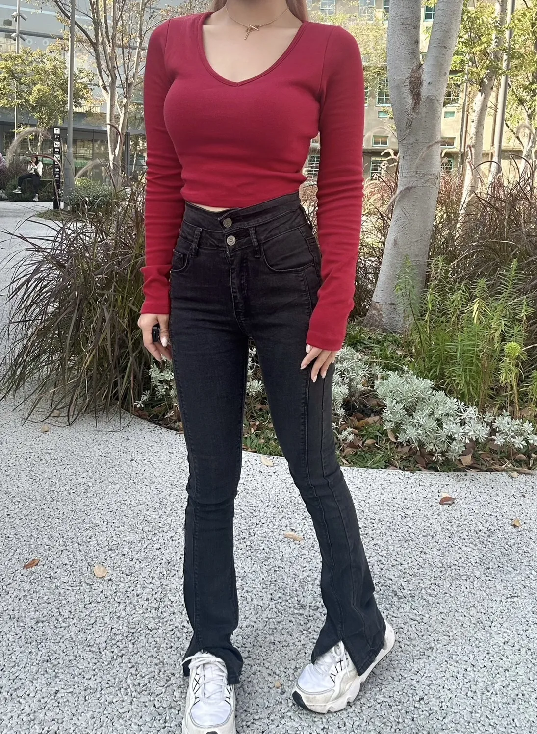 黑灰色高腰腰簍空開岔微喇長褲60106