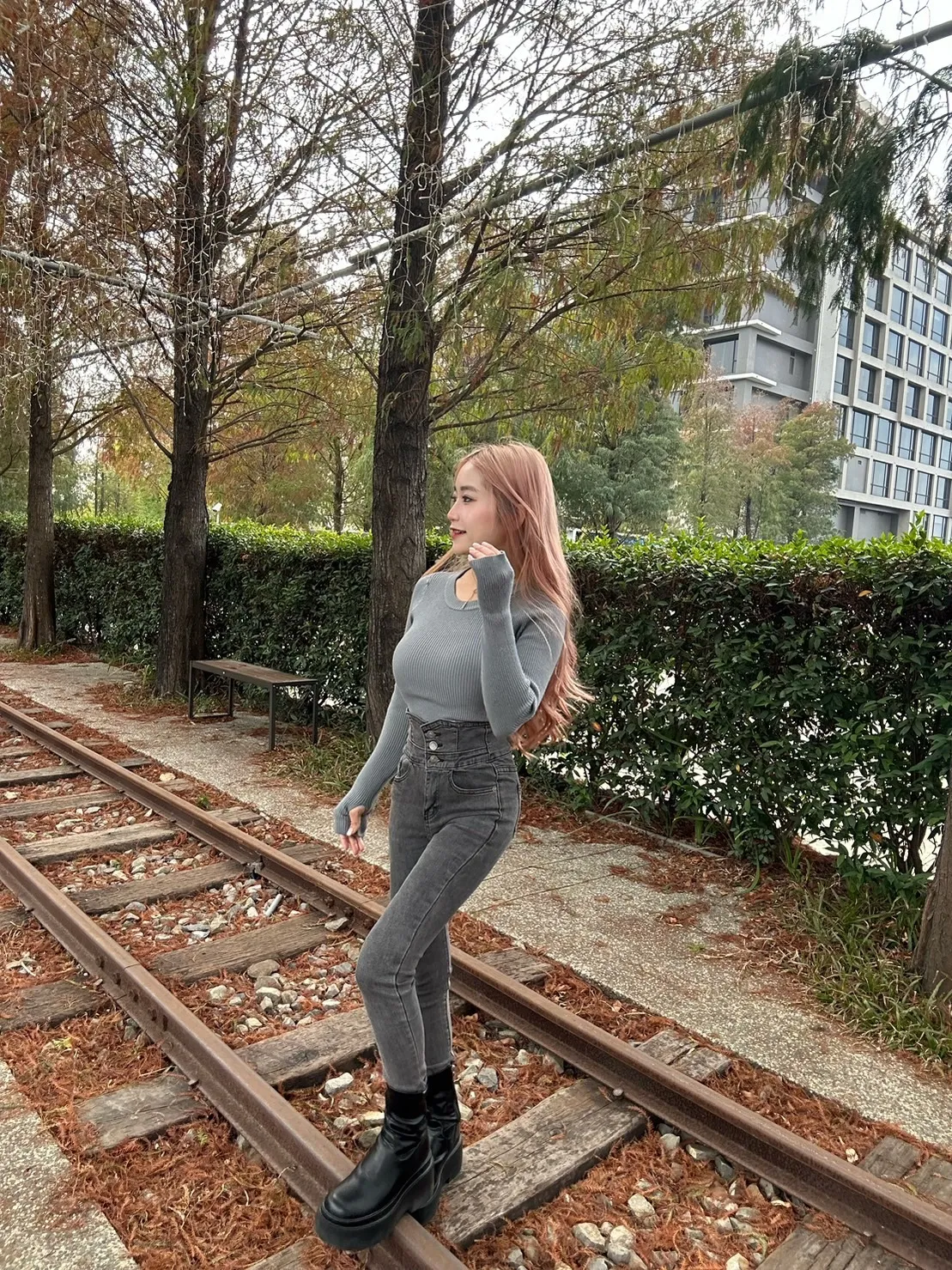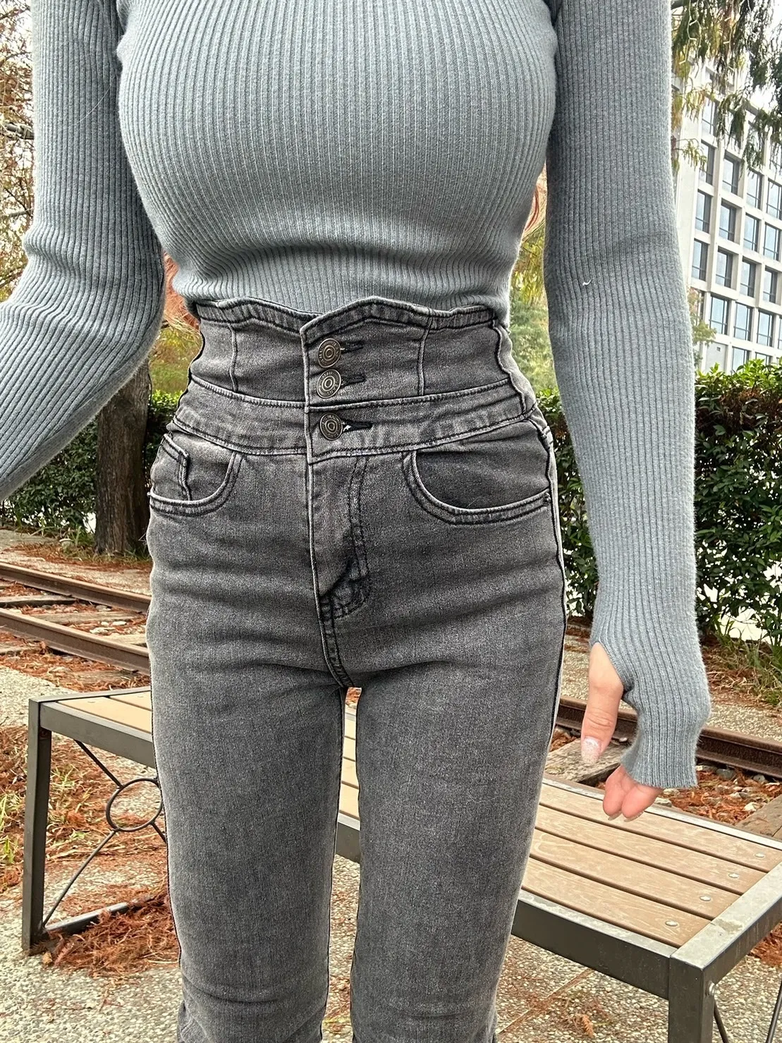 韓版拉腿神器超高腰三排扣顯瘦後腰交叉煙灰色牛仔長褲60252