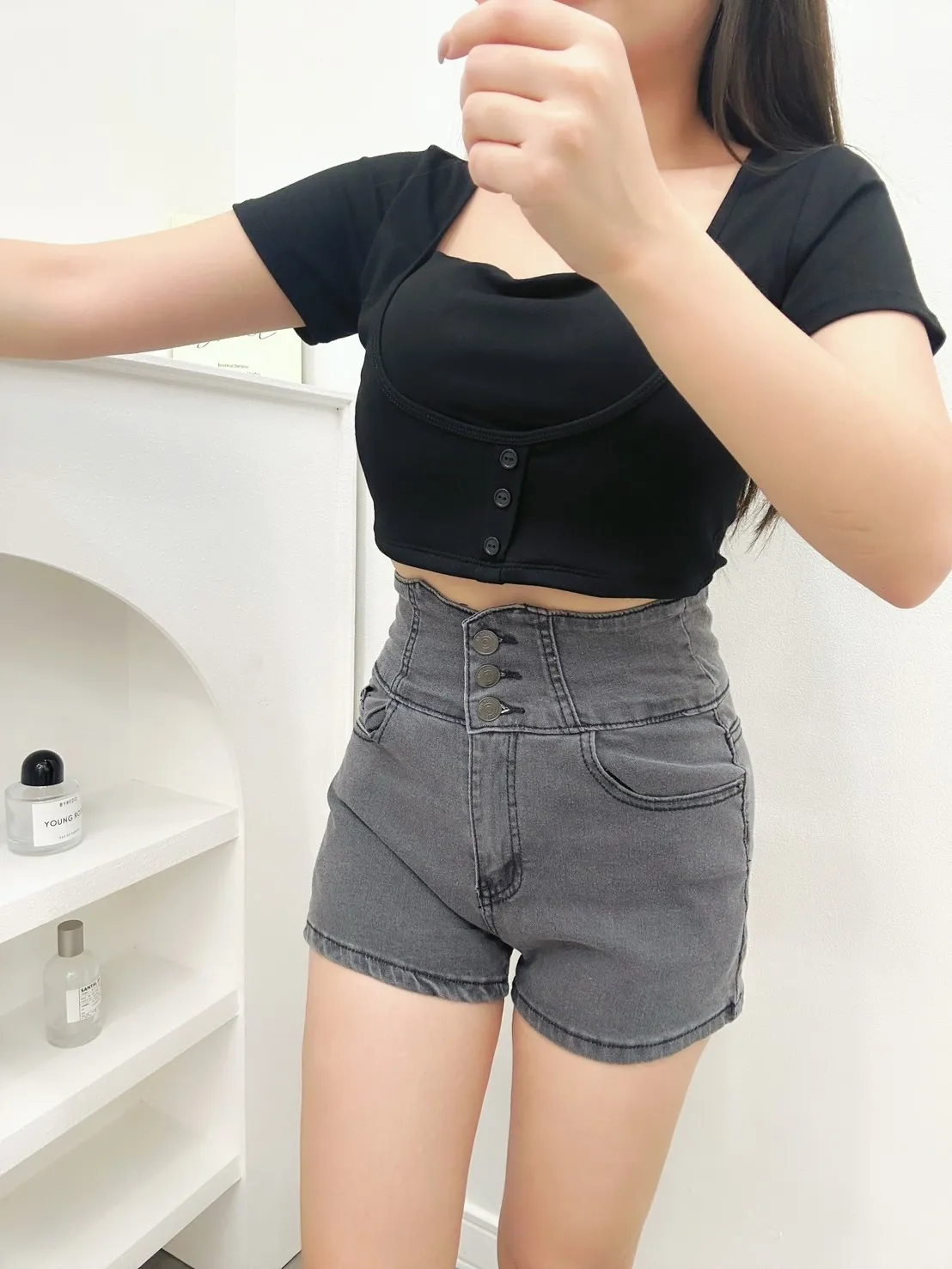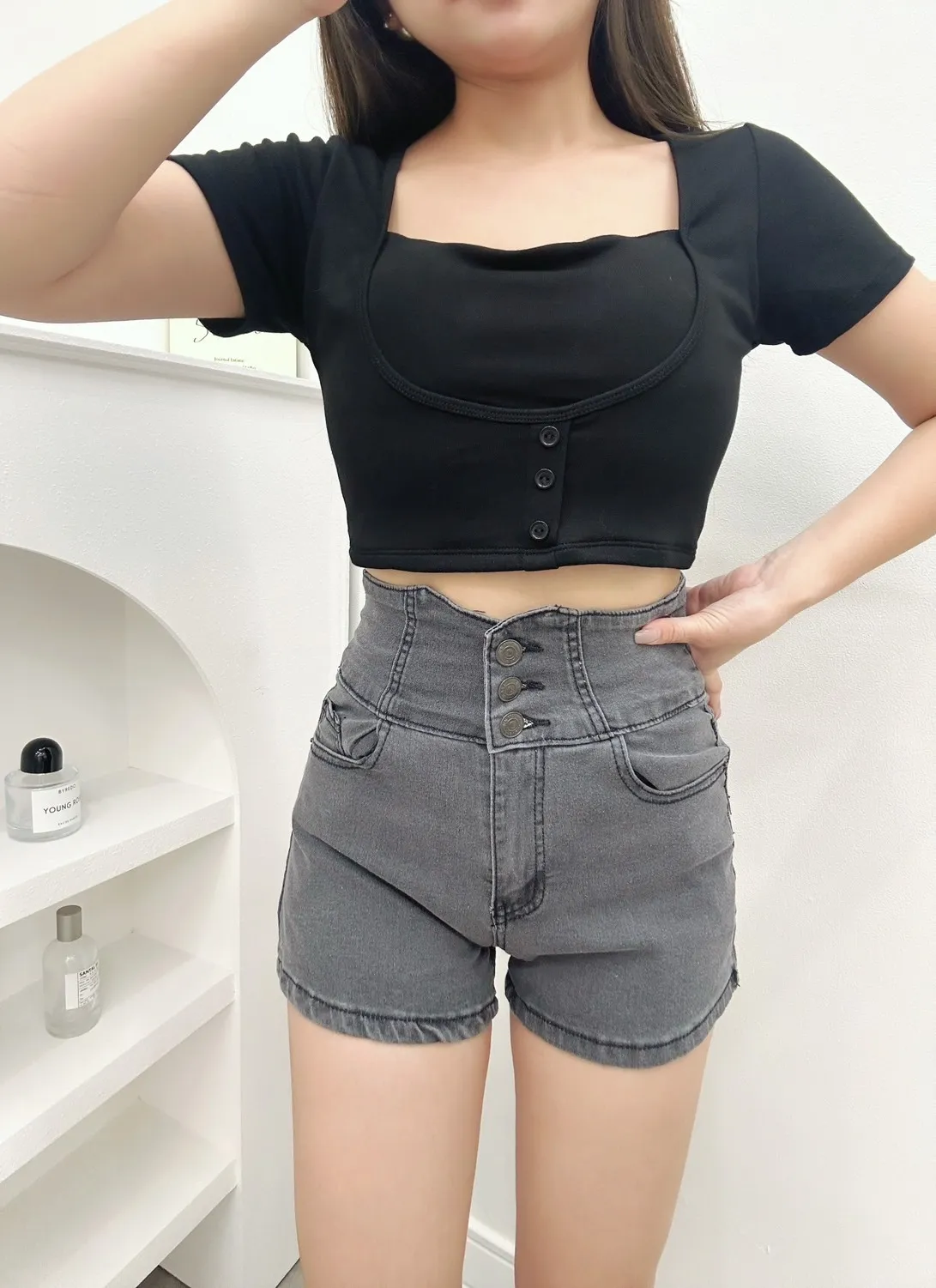 穿上身是真的很顯瘦!三排釦牛仔高腰短褲60319W_60320B_60318
