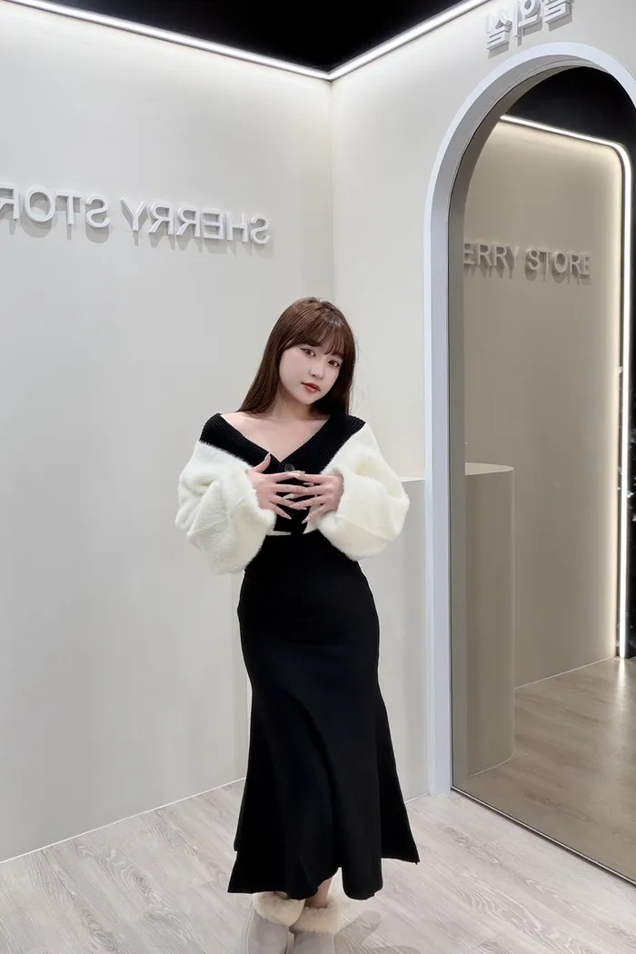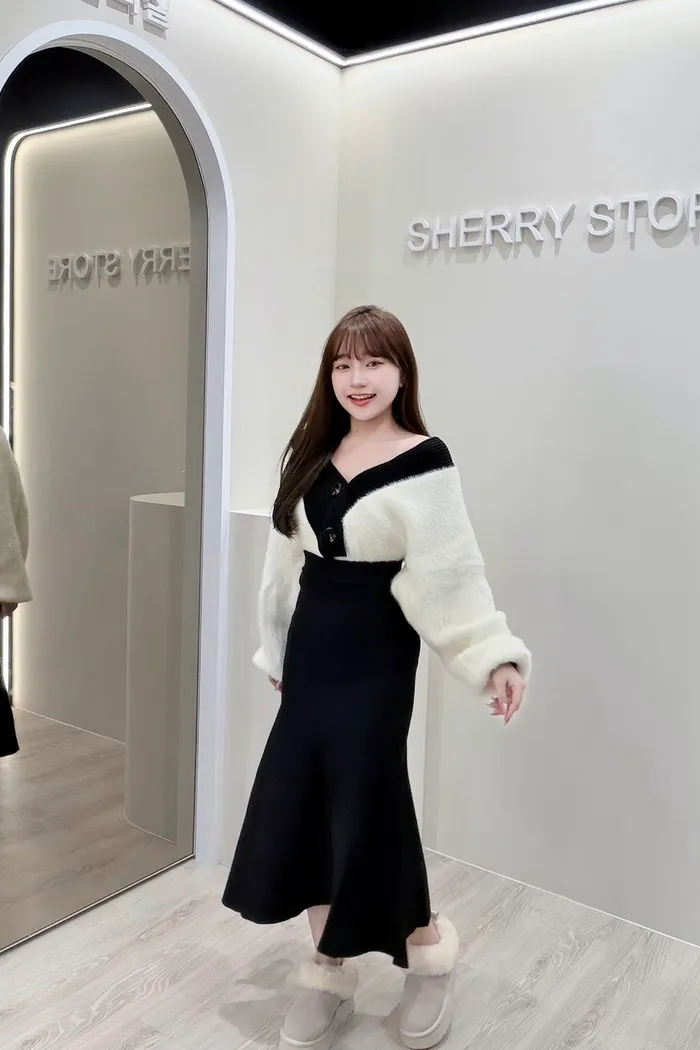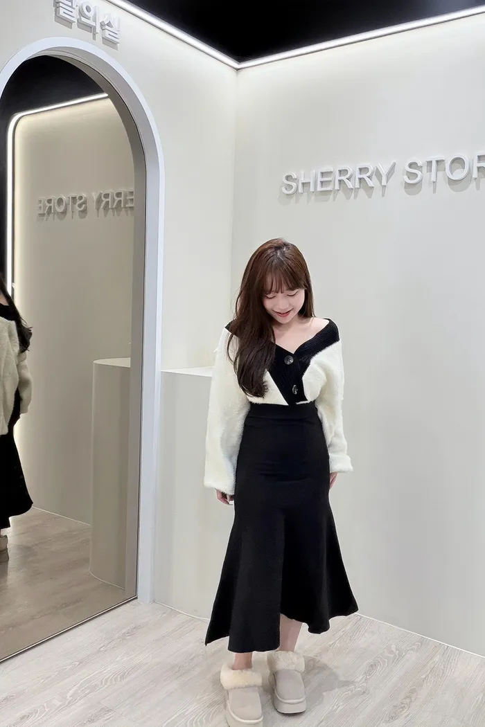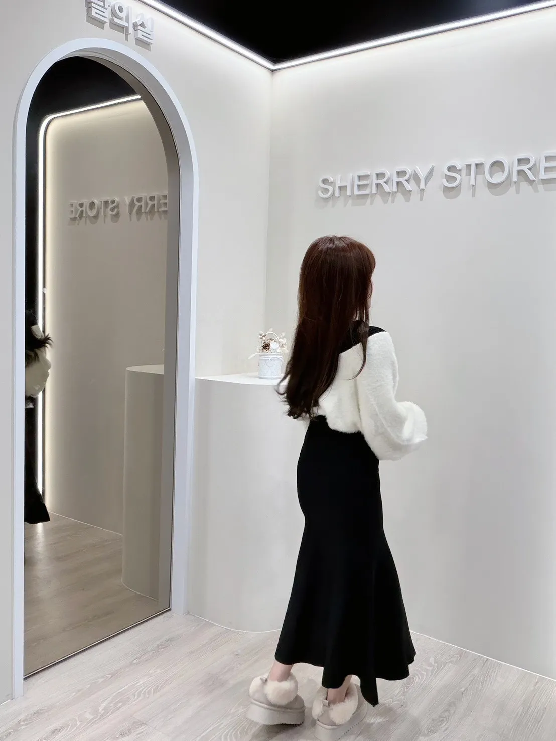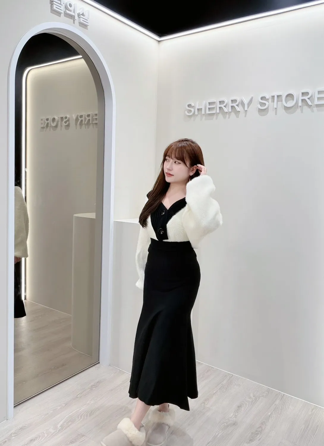 𝒔𝒉𝒆𝒓𝒓𝒚𝒔𝒕𝒐𝒓加州莊園撞色水貂毛鈕扣魚尾裙兩件套C1123