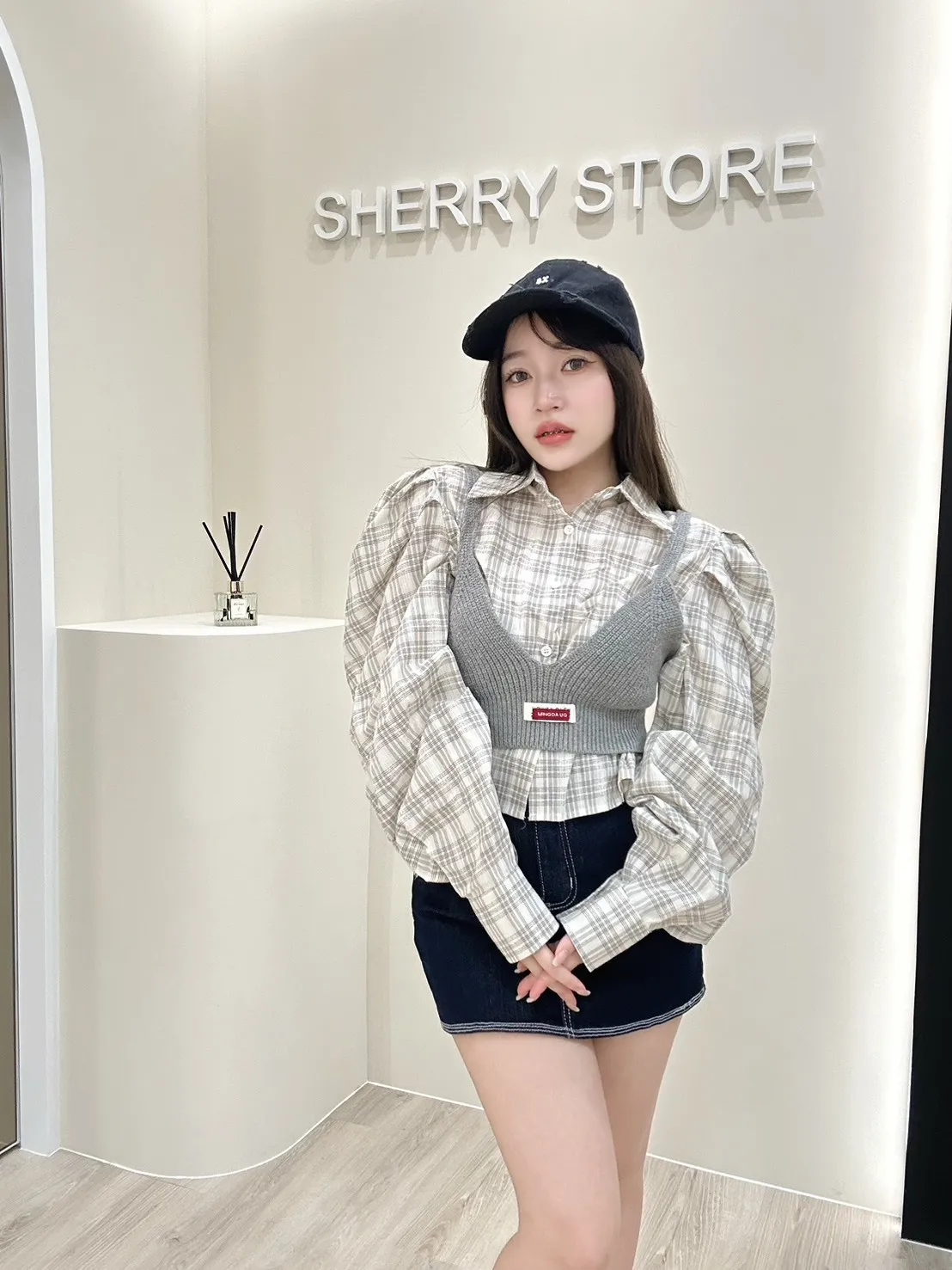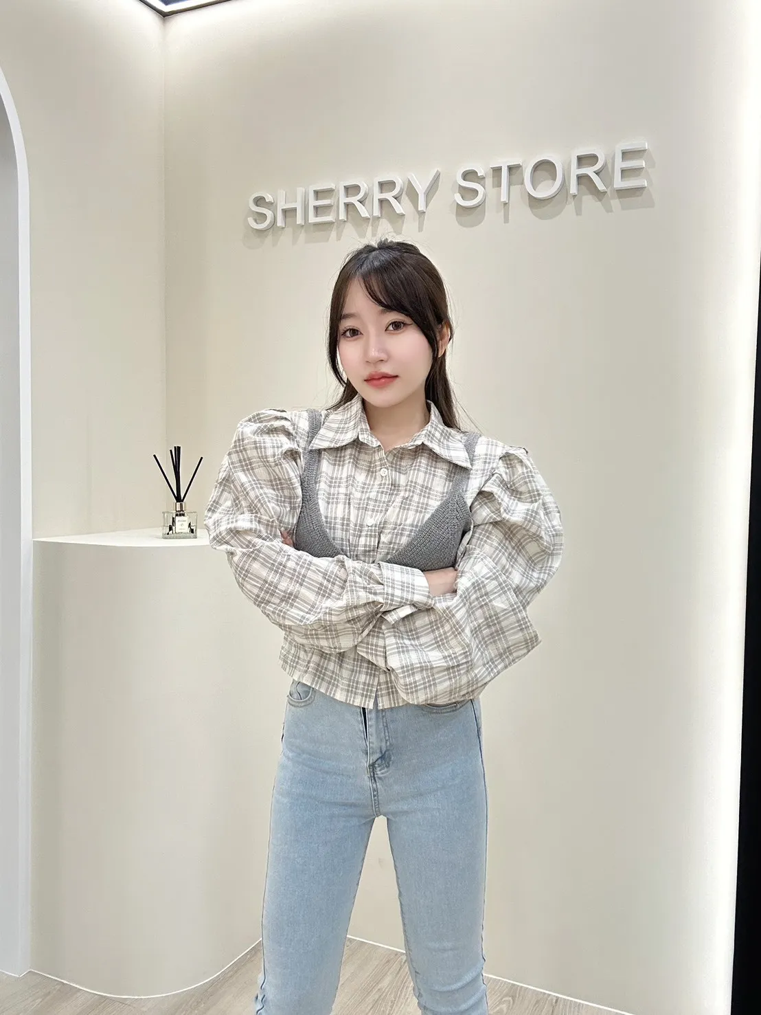 𝒔𝒉𝒆𝒓𝒓𝒚𝒔𝒕𝒐𝒓𝒆韓系韓妞墊肩格紋襯衫+針織背心兩件套ES8078