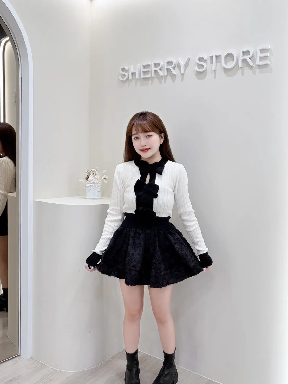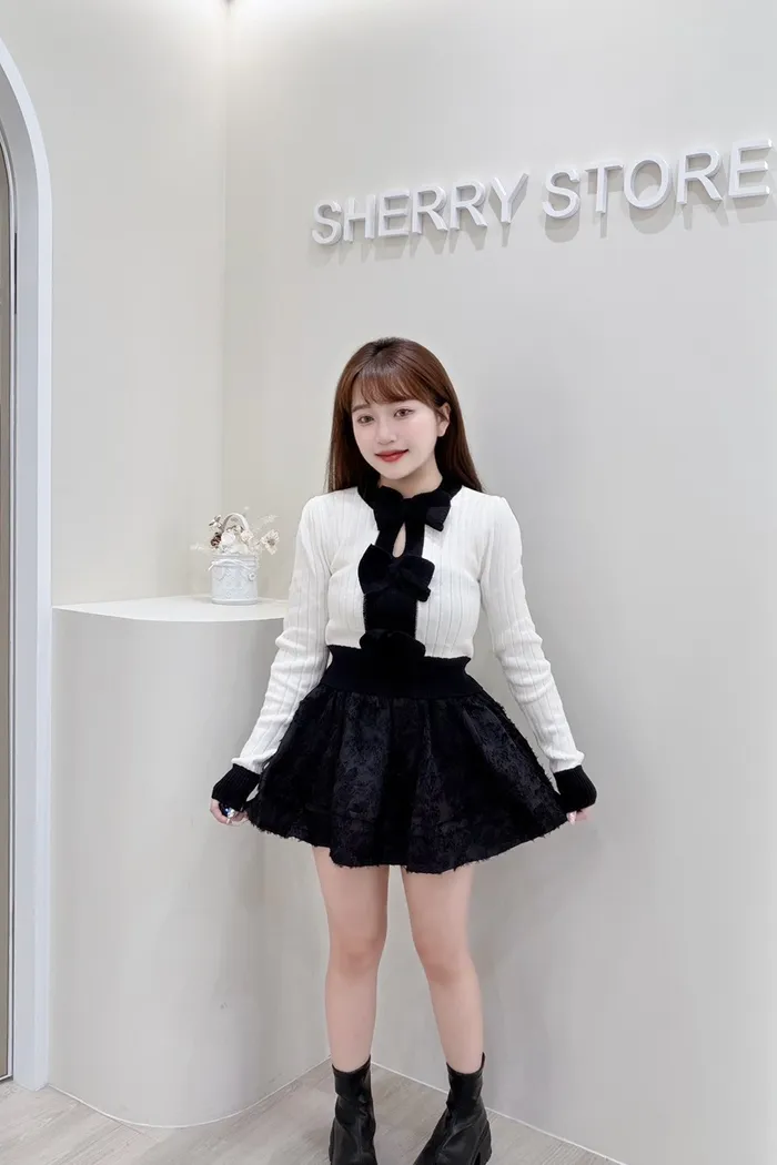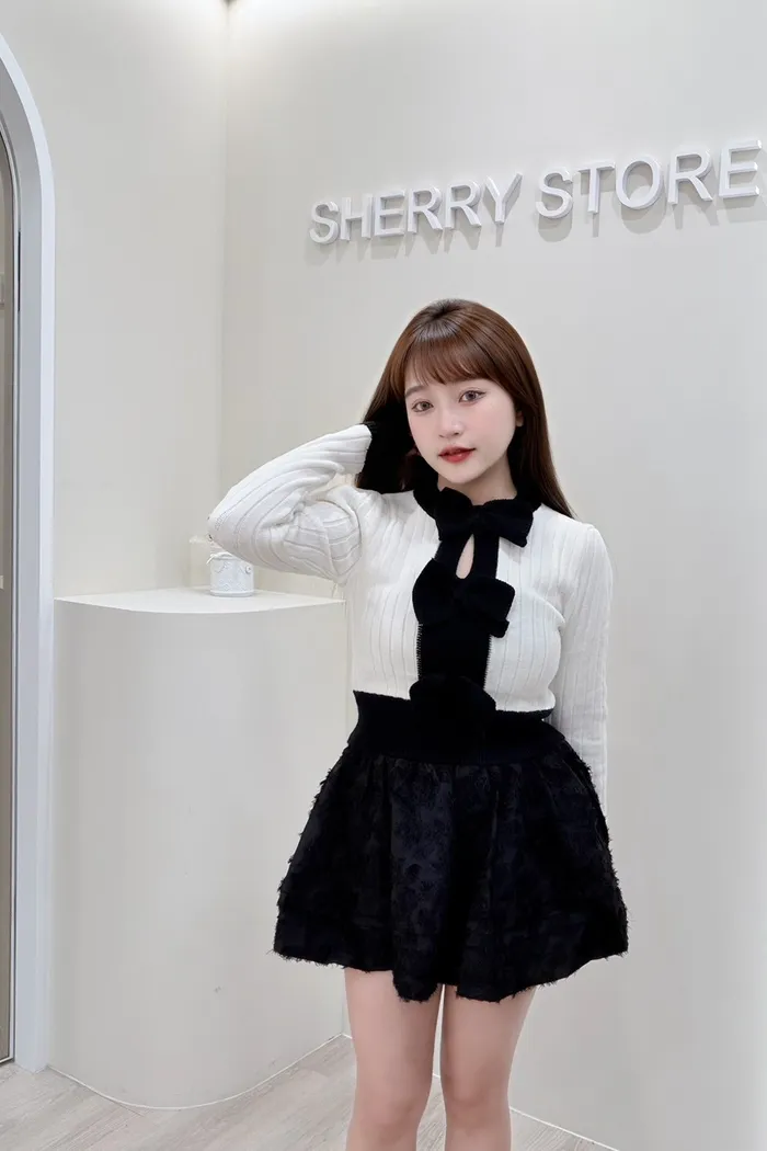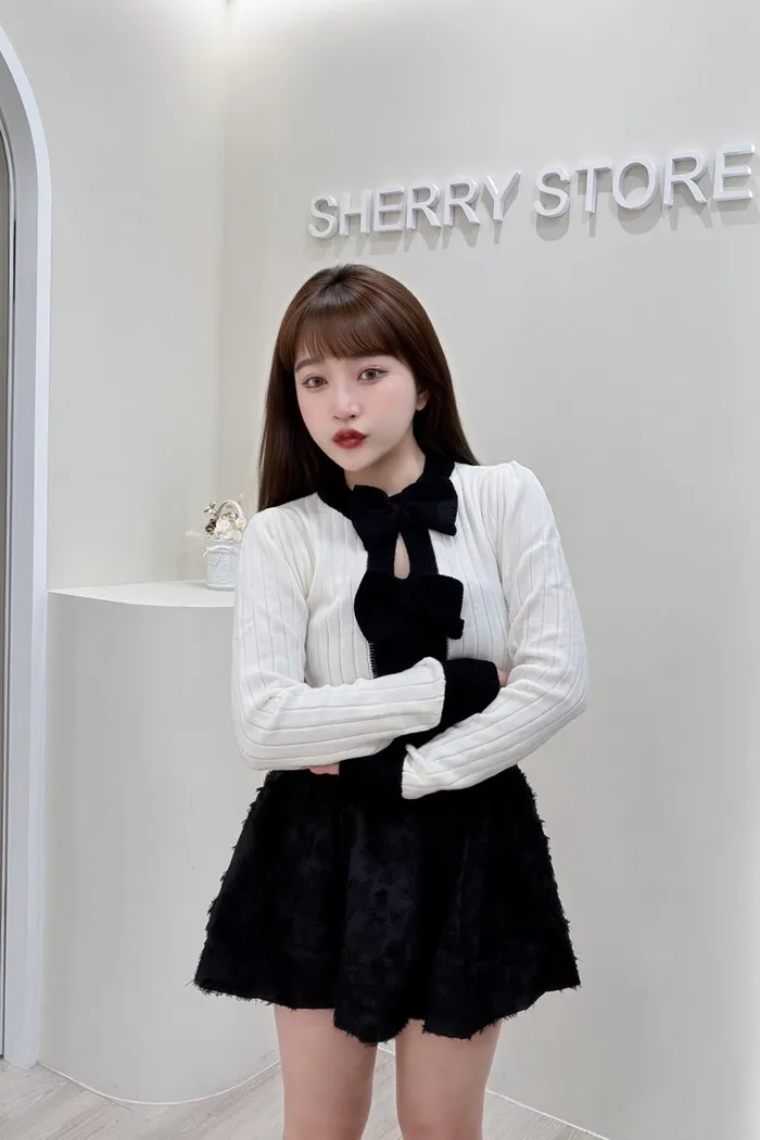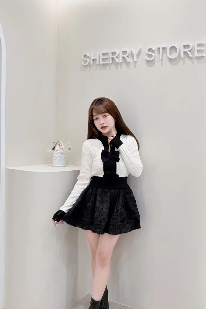 𝒔𝒉𝒆𝒓𝒓𝒚𝒔𝒕𝒐𝒓𝒆可愛純慾蝴蝶結胸鏤空針織上衣感蕾褲裙J7752