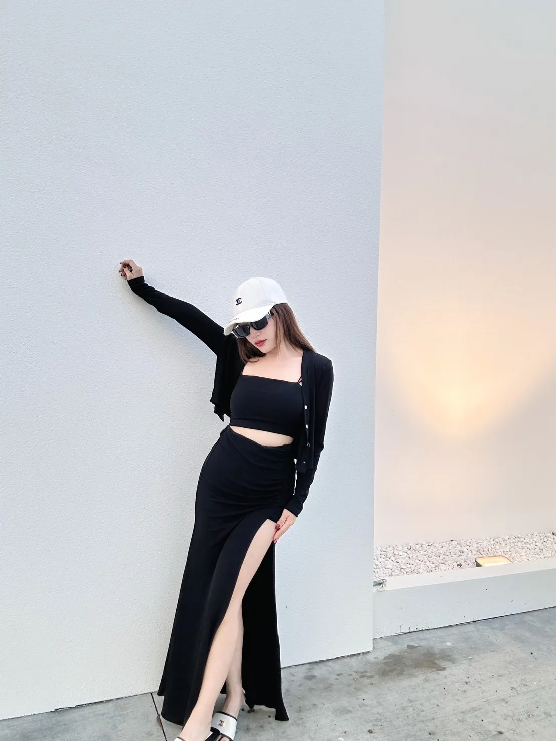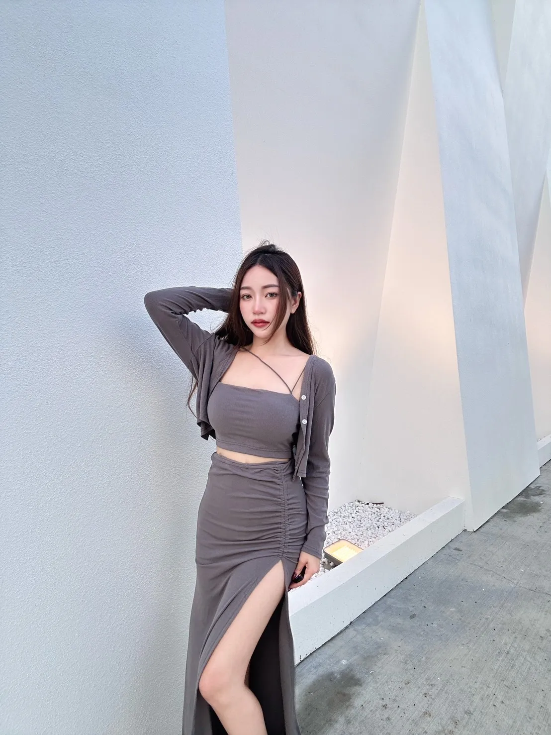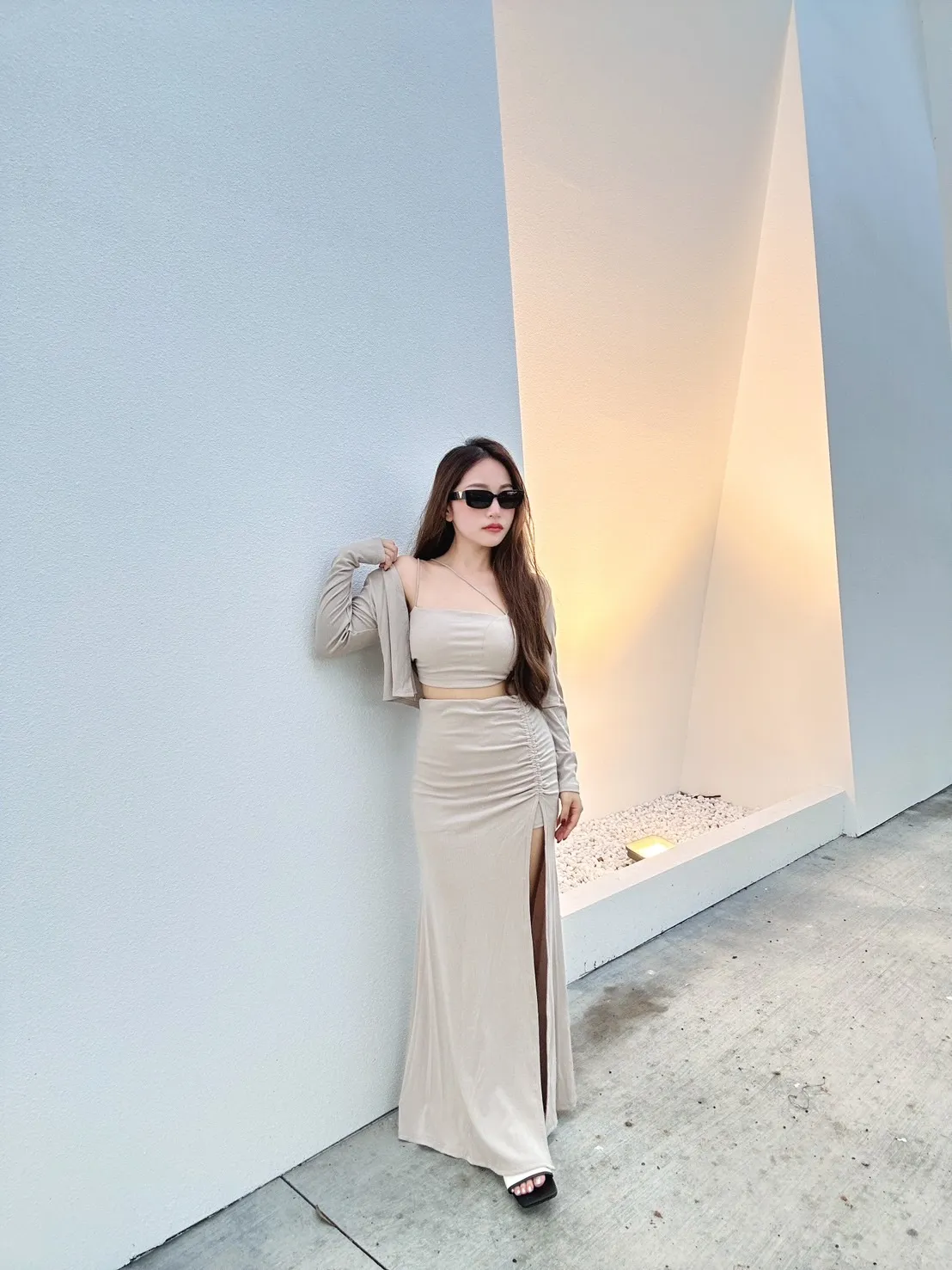 斜肩性感背心兩件套+高腰開衩抓皺長裙套裝L3886