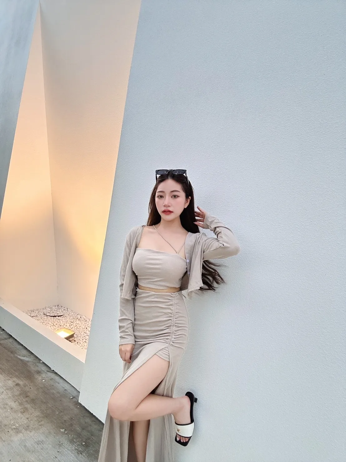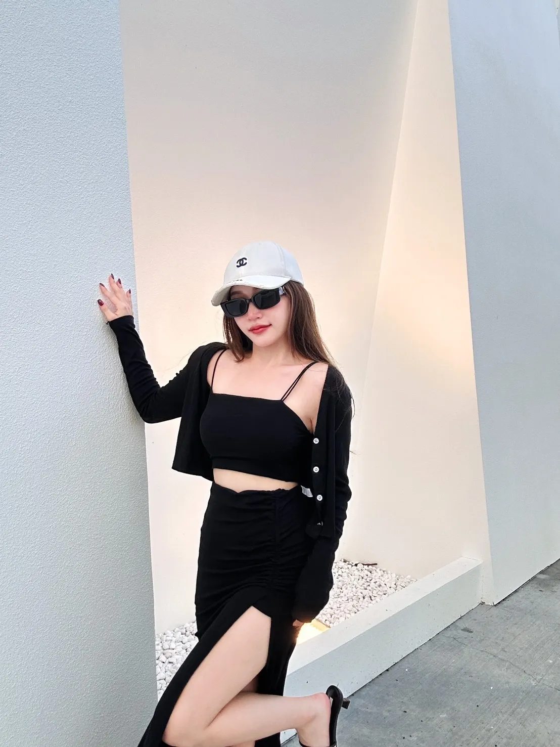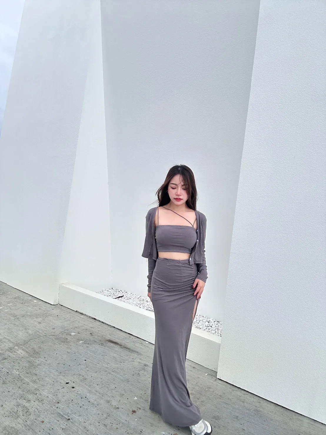 斜肩性感背心兩件套+高腰開衩抓皺長裙套裝L3886