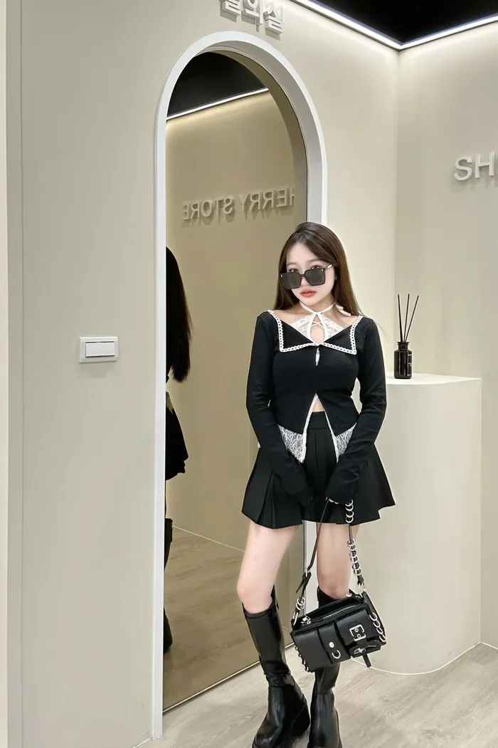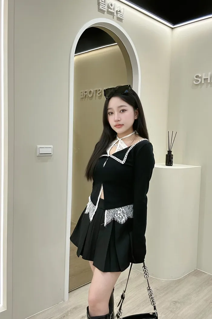 𝒔𝒉𝒆𝒓𝒓𝒚𝒔𝒕𝒐𝒓𝒆早秋薄款純欲黑色系蕾絲y2k兩件套裙R1364